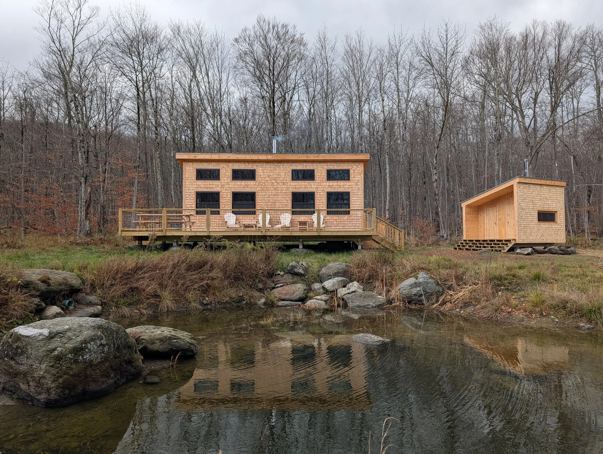 Located at the height of our land, and at the foot of Hunger Mountain, this hut is built as a backcountry base camp. A mountainside retreat with a sauna, it is ideally situated for four seasons of wilderness adventure.